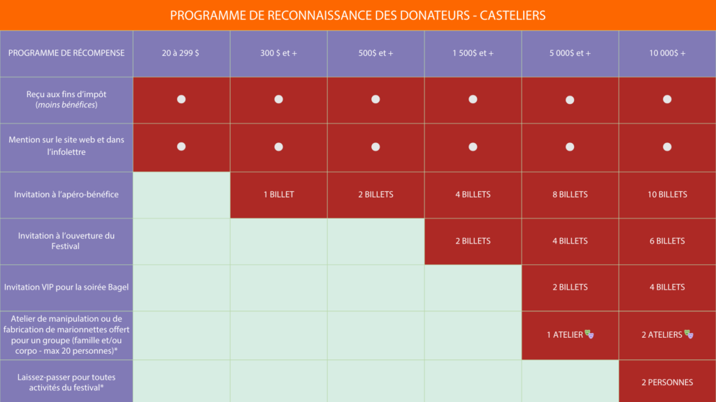 Peu importe le montant, chaque don fait une différence. Que vous donniez 25 $, 50 $, 100 $ ou même 500 $, vous soutenez la mission de Casteliers et contribuez à rendre les bienfaits de l’art de la marionnette accessibles à tous et toutes. |